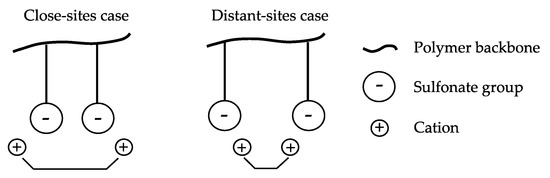 The distance between neighboring fixed groups and their relative spatial configuration can influence the transport rate of counter-ions. According to the distance-of-charge-separation concept, the proximity of neighboring fixed charges is a major contributor to divalent/monovalent selectivity, as illustrated in Figure 5 [57]. When ion exchange sites are widely separated (distant-sites case), monovalent Group I cations are preferred, whereas more closely packed sites (close-sites case) have an increased affinity for divalent Group II cations [58]. A large average distance between two adjacent fixed sulfonate groups eliminates the condensation of the monovalent cations that display higher mobility, whereas divalent ions are condensed, and the mobility ratio of divalent/monovalent ions is observed below 1 [41]. In contrast, the shorter the distance between active groups, the greater the preference for divalent ions over monovalent ions. Nevertheless, fundamental knowledge of the significance of the distance between fixed-charge groups and their distribution in CEMs is still poor, and research is needed to obtain a comprehensive understanding as it applies to electrodialysis.
