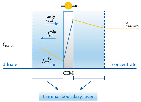 In electrodialysis, counter-ions are depleted on the membrane surface at the diluate side and accumulate at the concentrate side. Consequently, ion diffusion in the laminar boundary layer takes place in the same direction of migration for counter-ions and in the opposite direction for co-ions to satisfy the local electroneutrality assumption. The corresponding concentration profile for a cationic species in the laminar boundary layer and through the CEM is illustrated in Figure 6.