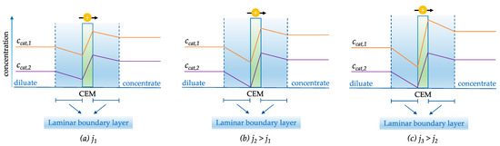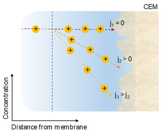 A lowered concentration of ions in the boundary layer increases the ohmic resistance and the energy input requirement to drive the ion transport [60,61]. This phenomenon is frequently termed concentration polarization [62]. With an increasing current density, concentration polarization increases as a result of the depletion of ions at the membrane/solution interface and the formation of steeper concentration profiles, as illustrated in Figure 7. When no current is drawn (j1 = 0), no ion transport across the CEM takes place, the boundary layer is negligible, and no concentration gradient of ions is formed. Upon drawing current, ions are depleted, and the rate of ion transport across the boundary layer approaches a steady state if sufficient ions are supplied to the membrane surface by diffusive transport (j2 > 0). By increasing the current, the concentration gradient in the boundary layer becomes steeper because the transport rate across the membrane is accelerated (j3 > j2) [8].