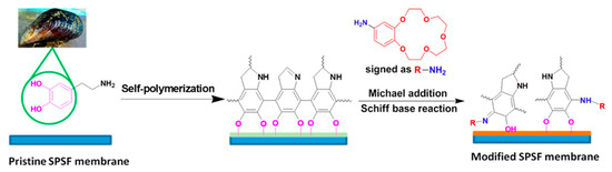 In situ polymerization of the monomers is the growth of polymer chains on the membrane surface, which is a means to introduce a synergetic layer. Surface polymerization of dopamine, aniline, and pyrrole to form the corresponding polymer has attracted considerable interest in the last few years [68,69,70,71]. Dopamine, for example, can be oxidized in an alkaline aqueous solution and binds to surfaces via strong adhesive forces [72]. Yang and co-workers [73] fabricated CEMs by modifying sulfonated polysulfone (sPSF) membranes via the co-deposition of dopamine and crown ether, followed by glutaraldehyde crosslinking (Figure 9). Oxygen atoms of the crown ether ring selectively bind specific metal ions through an ion−dipole interaction, which was mimicked by biological host−guest interactions between membrane proteins and ions. The resulting membrane yielded a selectivity of 5.99 in the K+/Mg2+ and 2.87 in the K+/Li+ systems, superior to commercial monovalent selective CEM NEOSAPTA CIMS (5.36 and 1.16). Monovalent selectivity was attributed to the pore-size sieving by the compact surface-modified layer and host−guest molecular recognition of the crown ether with K+ ions.