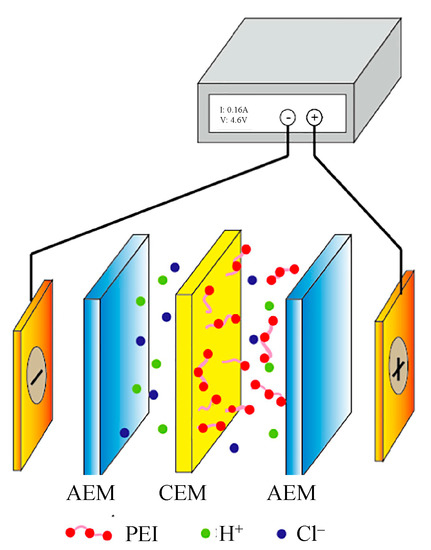 Lambert et al. [105] studied the separation of Na+ from Cr3+, using PEI-modified Nafion® 324. The separation percentages for Na+ and Cr3+ from the solution were 14% and 42%, respectively. Luo et al. [106] also modified a single layer of PEI on conventional heterogeneous CEMs by electro-deposition but with different molecular weights (Figure 12). The pilot-scale electrodialysis experiments showed that by using a moderate molecular weight of PEI, the selectivity for Ca2+/Na+ and Mg2+/Na+ systems was reduced from 0.36 and 0.81 to 0.11 and 0.12, respectively. Very recently, alternate electrodeposition of (PEI/PSS) bilayers on a polyacrylate-based was carried out to fabricate a monovalent selective CEM for Li+/Mg2+ separation [107], which revealed a selectivity of up to 4.59 and temporal retardation on divalent cations, while a quick passage for monovalent cations occurred through polyelectrolyte bilayers.