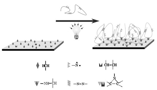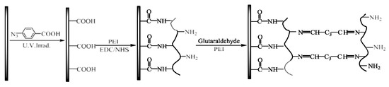 A spontaneous grafting of aryldiazonium salts is a way to form covalent bonds at the membrane surface [115]. A three-step modification comprising (i) diazonium-induced carboxyl group grafting under UV-light irradiation, (ii) grafting of PEI by amidation of the surface carboxyl groups, and (iii) glutaraldehyde-crosslinked PEI multilayers is represented in Figure 14 [116,117]. A series of electrodialysis studies on H+/Zn2+ and Na+/Mg2+ cells were conducted to evaluate the monovalent selectivity, which was reported to increase after immobilization by decreasing the divalent ion leakage rate to < 10% of the pristine membranes [116]. Using PEI-modified membranes reduced the Mg2+ and Zn2+ leakage by 75% and 81%, respectively, of their original value [117,118]. Modified membranes displayed stable performance after 60 days but exhibited increased membrane resistance.