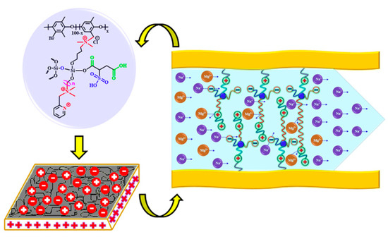 - An, S.; Liu, J.; Wang, J.; Zhu, H.; Ji, Z.; Zhang, T.; Zhao, Y.; Yuan, J. Synthesis and Characterization of Organic-Inorganic Cross-Linked Membrane for the Separation of Mono-Charged and Double Charged Ions Using UV Irradiation. Desalination 2019, 464, 8–17. [Google Scholar] [CrossRef]