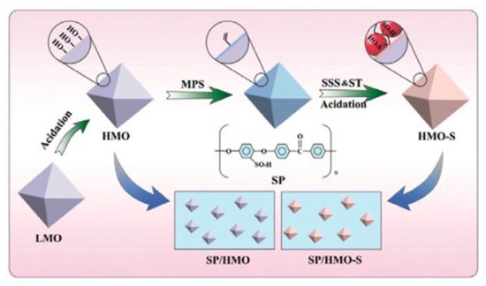 In contrast to the simple immersion coating of substrates in polyelectrolyte solutions, Afsar et al. [97] fabricated modified polyvinyl alcohol-based (PVA) membranes by alternately spray-coating cationic layers of quaternized PPO and anionic sulfonated PPO (Figure 11) [98,99,100] and observed an ion selectivity value of 5 in Li+/Mg2+ system with high resistance (23.54 Ω⋅cm2) due to the formation of a thick, dense layer by the spray-coating method. Subsequently, the number of deposited layers was decreased to one cationic polymer but crosslinked with glutaraldehyde, resulting in a selectivity of 12.7 for Li+/Mg2+ with a reduced resistance [101].