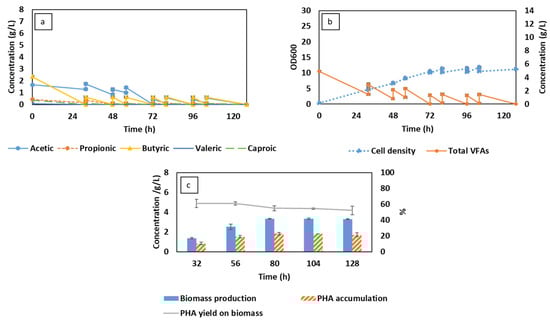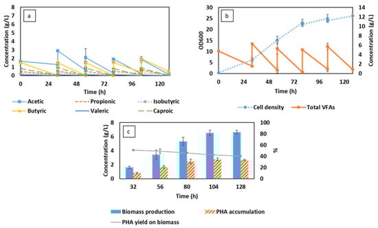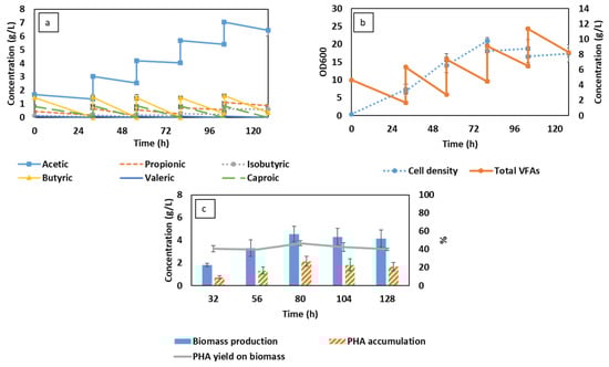 Changes in volatile fatty acid (VFA) compositions (a), total VFA concentration, and cell density (b) corresponding to biomass production and PHA accumulation (c) during MBR-integrated semi-continuous fermentation using synthetic VFAs.