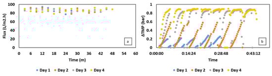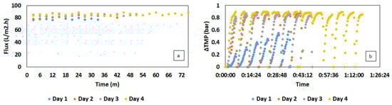 In the aspect of filtration performance, lower biomass concentration was partly beneficial for the membrane operation. In particular, the increase in cell concentration can result in an increase in viscosity and the deposition of bacterial cells on the membrane surface, which can gradually raise the TMP [27]. This behavior can be observed in Figure 5b, in which the TMP in the first two days rose moderately, corresponding to the increase in the biomass concentration from 1.3 to 2.5 g/L (Figure 4c). Similar to the filtration in MBR using synthetic VFAs, the TMP in this experiment only reached the extreme level of 0.9 bar as the biomass content was around 3.3 g/L. Lower cell density, moreover, could mitigate the process of membrane fouling under a high permeate flux of 78–92 L per m2/h, thereby reducing the filtration time (Figure 5a).