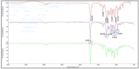 Comparison of Fourier-Transform Infrared Spectriscopy (FTIR) spectra between commercial poly(β-hydroxybutyrate-β-hydroxyvalerate) (PHBV) (red line) and extracted polyhydroxyalkanoate (PHA) obtained from cultivation of C. necator DSM 545 in a different medium of synthetic VFAs (purple line), and real VFA effluent (green line).