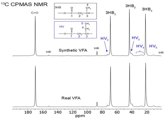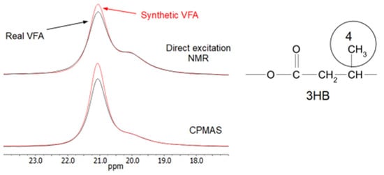 Comparison of the HB methyl area of the CPMAS and direct excitation NMR spectra of Synthetic VFAs and Real VFAs.