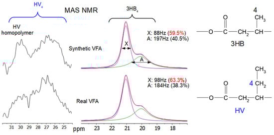 Comparison of the 3HB4 and HV4 areas of the direct excitation MAS NMR spectra from synthetic VFAs and real VFAs. The peak labelled X is due to the methyl carbons of the 3HB polymer associated with the ordered areas while the peak labelled A is associated with the 3HB polymer methyl carbons in the more disordered areas. The linewidths and populations (in brackets) of each peak are as shown for each sample.