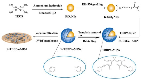 In this study, we prepared a TBBPA imprinted membrane by incorporating the imprinted silica nanoparticles (SiO2 NPs) onto polyvinylidene difluoride (PVDF) microfiltration membranes via vacuum-assisted filtration. SiO2 NPs were adopted as the supporters for imprinting TBBPA, mainly because: (i) SiO2 NPs are non-toxic, inexpensive, and easy to manufacture, and have a large specific surface area as well as good physicochemical stability [19]; (ii) abundant hydroxyl groups are present on the SiO2 NPs surface [20], which can be easily used as grafting sites to construct imprinted cavities. The TBBPA imprinted layer was synthesized on the 3-(methacryloyloxy) propyltrimethoxysilane (KH-570) modified SiO2 NPs by a surface imprinting approach using 4-vinylpridine (4-VP) and ethylene glycoldimethacrylate (EGDMA) as a functional monomer and cross-linker, respectively. Eluted TBBPA molecularly imprinted nanoparticles (E-TBBPA-MINs) were incorporated onto a PVDF membrane via vacuum-assisted filtration. The rebinding ability, selective separation capacity, and the mechanisms of the E-TBBPA-MINs embedded membrane (E-TBBPA-MIM) toward TBBPA were systematically investigated through the adsorption kinetics, isothermal adsorption, rebinding selectivity, and stability experiments. This study provides a promising strategy to develop molecularly imprinted membranes for the separation and removal of specific pollutants such as EDCs.