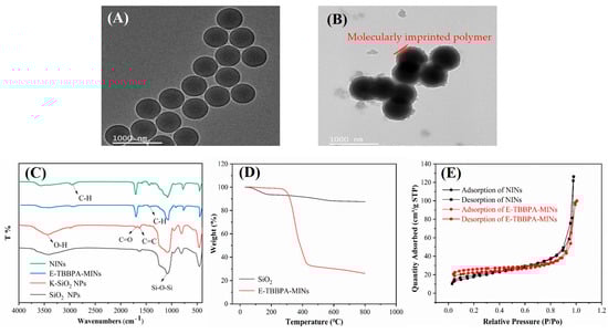 TEM images of (A) SiO2 NPs and (B) E-TBBPA-MINs. (C) FTIR spectra identifying the different functional groups of all types of NPs. (D) TGA curves for SiO2 NPs and E-TBBPA-MINs. (E) N2 adsorption-desorption isotherms of NINs and E-TBBPA-MINs.