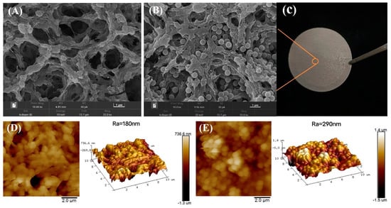 SEM images of (A) the pristine PVDF membrane and (B) E-TBBPA-MINs embedded mem brane (E-TBBPA-MIM). (C) photograph of E-TBBPA-MIM. AFM images and relative average roughness (Ra) of (D) the pristine PVDF membrane and (E) E-TBBPA-MIM.