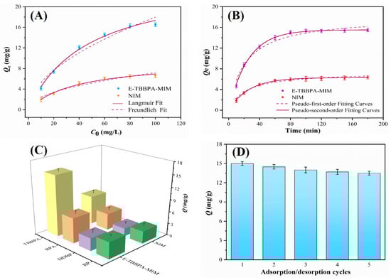 Adsorption isotherms (A) and kinetics (B) isotherms for E-TBBPA-MIM and NIM. (C) Selective adsorption results of E-TBBPA-MIM and NIM. (D) Stability of the E-TBBPA-MIM after exposure to varying adsorption/desorption cycles.