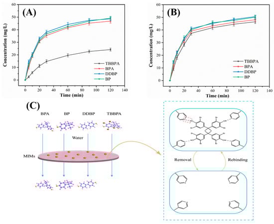 Permselectivity behaviors toward the template molecule, i.e., TPPBA, were elucidated to better understand the specific adsorption separation properties of E-TBBPA-MIM. Time-dependent permselectivity behaviors of E-TBBPA-MIM and NIM for TBBPA were investigated using BP, BPA, and DDBP as the competitive molecules (Figure 5A,B). As shown in Figure 5A,B, at any time interval, E-TBBPA-MIM and NIM resulted in the similar effluent concentrations of BP, BPA, and DDBP, indicating that the imprinted cavities on the E-TBBPA-MIM showed no specific recognition capacity toward the structural analogues of TBBPA, since either the presence or absence of imprinted cavities did not influence the permeation behaviors of these compounds. This is unsurprising because molecules, which cannot be specifically recognized by the MIMs, are known to penetrate the membranes by diffusion/convection [46]. It can be also observed that the E-TBBPA-MIM exhibited significantly greater separation performance for TBBPA than other molecules, but there was no obvious difference between the separation performance of NIM for all the types of molecules. This may be due to the fact that there existed no specific sites on the NIM available for TBBPA adsorption, thus TBBPA penetrated the membranes with other molecules in the same manner [37]. As depicted in Table S4, the permselectivity factors (β) of E-TBBPA-MIM toward BP, BPA, and DDBP were 6.74, 5.24, and 6.31, much greater than those of NIM (i.e., 1.47, 1.17 and 1.56 for BP, BPA, and DDBP, respectively), indicating the successful construction of specific recognition sites, which contributed to the excellent separation performance of E-TBBPA-MIM for TBBPA.