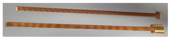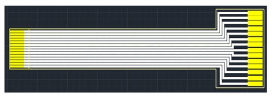 As the flexible 8-in-1 microsensor involves multiple different micro-electro-mechanical systems technology steps, the yield of microsensors is a major issue. Therefore, in order to reduce the cost of each flexible 8-in-1 microsensor, incremental short head sensors were used, and 112 microsensors could be produced at a time under the condition of 100% yield. To coordinate with this type of short head microsensor and reduce the difficulty of embedding it in the proton battery stack, this study followed the Flexible Printed Circuit (FPC) designed in the circle, drew the design drawing of the FPC using drawing software, and commissioned a manufacturer to produce it in batches. The design drawing and the end product of FPC are shown in Figure 3 and Figure 4, respectively.