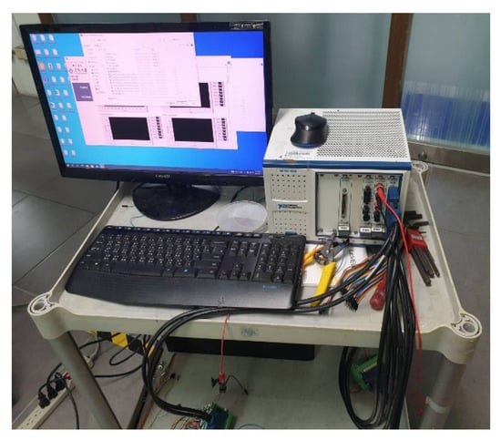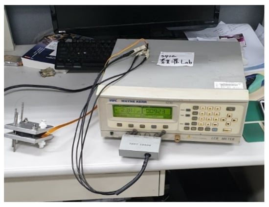 In this study, the NI PXI 2575 (SHINING TECHNOLOGIES Co., Ltd., Hsinchu, Taiwan) digital acquisition unit of National Instruments (NI) (as shown in Figure 8) was used to capture the resistance and current variations of micro temperature, humidity, flow, hydrogen, and oxygen sensors. The data were extracted via the software control system designed by the LabVIEW system, and the correction curve was obtained from the extracted data for subsequent experiments. The variation in the micro clamping pressure sensor gave the capacitance, so the data were extracted using an LCR meter, as shown in Figure 9.