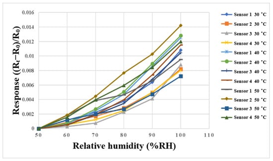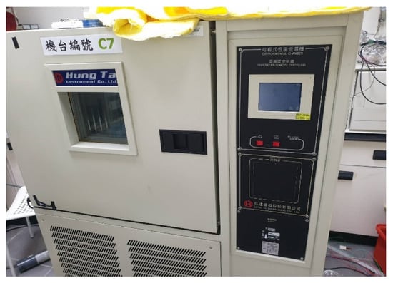 A program-controlled constant temperature and humidity testing machine (Hung ta HT-8045A Environmental Chamber, Hung Ta Instrument Co., Ltd., Taichung, Taiwan, Figure 11) was used for humidity correction in this study. This experiment was performed using 30 °C, 40 °C, and 50 °C, the relative humidity was 50% to 100%, and the correction was performed at increments of 10%. In addition, in order to ensure the accuracy of the humidity displayed by the oven, two commercially available temperature and humidity sensors were used for correction experiments. The time interval of the NI PXI 2575 data acquisition unit was recorded when the values of constant temperature and humidity machine, and the two commercially available temperature and humidity sensors, were consistent. After 30 min of stabilization each time, the resistance value in the interval was captured by the NI PXI 2575 data acquisition unit. The correction curve is shown in Figure 12.