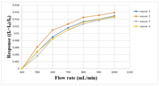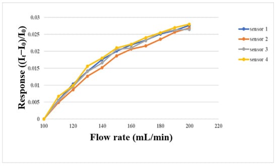 The micro flow sensor was embedded in the flow channel of the oxygen end runner plate with continuous fluid flow, because only this part had continuous fluid flow. First, the micro flow sensor was embedded in the battery to simulate the actual correction environment, and then the power supply, sensor, and NI PXI 2575 were connected in series. The power supply provided a stable 5 V voltage, the microsensor generated heat, and the current dropped. When the fluid flew, the generated heat was carried away to induce an increase in the current. At this time, the current variation was captured. The gas and fluid supply equipment in this experiment was an eight-channel machine, with the measurements conducted from 400 mL/min to 1000 mL/min at intervals of 100 mL/min. The gas flow correction results are shown in Figure 13. Water was used as the fluid for correction in this study, and the YOTEC WS (TOHAMA Co., Ltd., Hsinchu, Taiwan) Series variable speed flow pump was operated. The correction range was based on 100 mL/min, and the measurement was performed at intervals of 10 mL/min until 200 mL/min. The correction results are shown in Figure 14.
