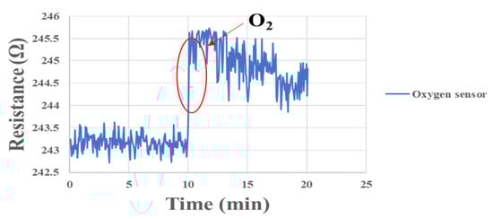 In order to simulate the oxygen flow in the flow channel, the micro oxygen sensor was embedded in the fuel cell flow channel for correction in this experiment. Furthermore, the oxygen provided by the eight-channel fuel cell testing machine was used for correction. The experimental configuration is shown in Figure 16. After the micro oxygen sensor was embedded in the battery, the oxygen at normal temperature and constant flow was admitted, and the resistance variation was captured by NI. When a high concentration of oxygen atoms (O) contacted the surface of a gas-sensing thin film, the electrons inside the material were captured to form adsorbates, e.g., oxygen ions (O-), leading to a depletion of the semiconductor surface. As a result, the electrons inside the gas-sensing thin film decreased, and the impedance of the sensing material increased rapidly, as shown in Figure 17.