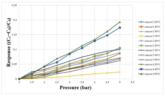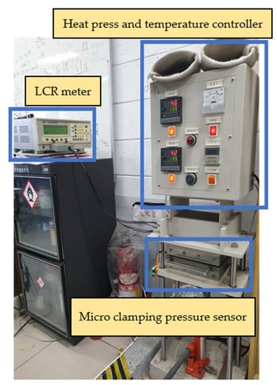 The micro clamping pressure sensor in this study mainly measured the pressure of the runner plate ribs during the operation of the proton battery stack. First, the micro clamping pressure sensor was aligned with the ribs of the oxygen end runner plate and fixed. Afterwards, the LCR meter was connected to the back end of the microsensor, and the hot press provided the required pressure and temperature conditions for correction. The correcting instrument’s configuration is shown in Figure 18. The pressure range was from 1 to 5 bars at intervals of 0.5 bars, and the correction was performed at 30 °C, 40 °C, and 50 °C. The correction curve is shown in Figure 19.