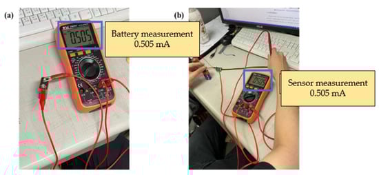 This study used a digital multimeter to check whether the measurements of the micro voltage sensor and micro current sensor were correct. The battery voltage and current were verified by using the electric meter in the correction procedures, and then the micro sensing head was connected to the battery, as shown in Figure 20 and Figure 21. This connection ensured that the micro voltage sensor and micro current sensor could measure values correctly.