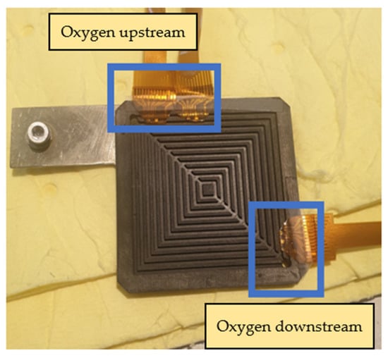 The main body of the proton battery stack was jointly designed by the previous laboratory team and HOMYTECH Global Co., Ltd. [20]. The position where the flexible 8-in-1 microsensor is embedded is upstream and downstream of the oxygen terminals on both sides and upstream and downstream of the hydrogen terminals on both sides. A total of eight microsensors are embedded to measure and capture data at the same time, as shown in Figure 22 and Figure 23.