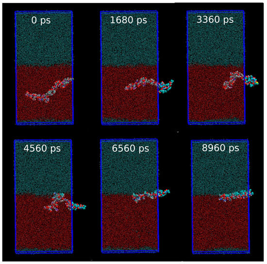 Snapshots from a 10 ns run showing the capture of the Aβ1-42 peptide by a hydrophobic–hydrophilic interface, water molecules are shown in red (dots) and DCE molecules are shown in blue/gray (dots).