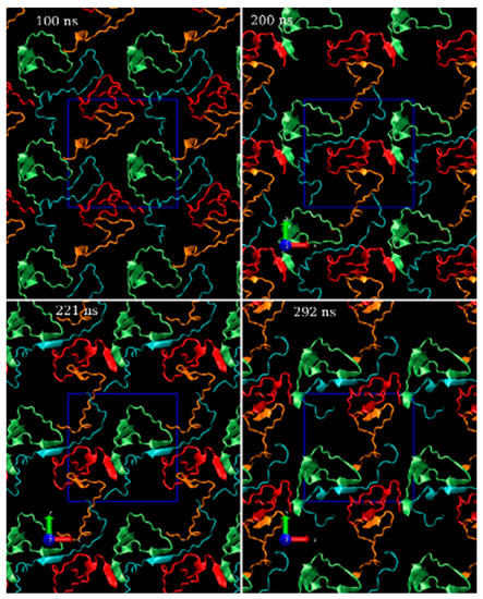 Snapshots showing aggregation of Aβ1-42 peptides at a DCE–water interface. Four chains are shown in cyan, red, lime green and orange together with protein secondary structure. The dark blue box outline indicates the 2D profile of the periodic box, which shows an average dimension of ~6.25 nm × 6.15 nm.
