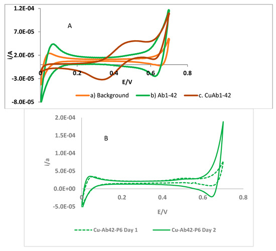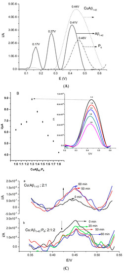 At a physiological pH, DPVs at the ITIES showed three distinct peaks at potentials 0.17 V, 0.27 V and 0.41 V vs. Ag/AgCl, (Figure 6A, solid line) for the peptide Aβ(1-42). This is likely because of the effects of the liquid–liquid interface on the structure and conformation of the peptide. Zhai and co-workers [49] reported the significant unfolding of the aromatic residues of the hydrophobic core of the globular protein α-lactalbumin upon adsorption at oil–water interfaces. In contrast, the peptide (P6) shows a single peak at 0.46 V vs. Ag/AgCl (Figure 6 dashed line). Upon the addition of Cu (in a 1:1 ratio) to the aqueous phase, a single significant peak at 0.44 V was observed (Figure 6 dotted line). We believe this peak is due to the transfer by the interfacial complexation of Aβ1-42 with the copper ion: