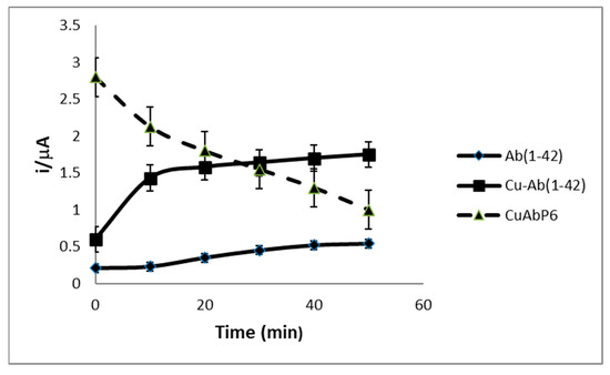 Summary of the effect of time (0–60 min) on changes in current, at a potential of 0.46 V, observed at the electrified liquid–liquid interface for Aβ(1-42), 1:1 Aβ(1-42) Cu complex and upon addition of P6 to the complex at an Aβ(1-42) Cu:P6: 1:3 ratio.
