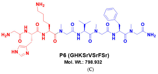 Several strategies have been proposed to intercept the formation of toxic beta-amyloid fibrils in the presence of redox-active metal ions. Recently, the work conducted by Rajasekhar and co-workers reported a multifunctional peptidomimetic inhibitor, P6, (Gly-His-Lys-Sr-Val-Sr-Phe-Sr) [23], with a pKa > than 9 which forms a 1:1 complex with Cu2+ (Scheme 1C). The molecule has a dual function of preventing the formation of Aβ oligomers and fibrils and sequestering Cu2+ from Aβ-Cu2+ complexes. P6, acts as an inhibitor of multifaceted Aβ toxicity by silencing the Aβ-Cu2+ redox cycle, which can generate Reactive Oxygen Species (ROS) through Fenton-type reactions. Further, it was shown, by employing various biophysical studies, that P6 interacts with Aβ and prevents the formation of toxic Aβ forms, such as oligomeric species and fibrillar aggregates.