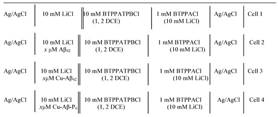 All the chemicals used were of analytical grade or better. Aβ(1-42) human peptide was purchased from Discovery Peptide (Billingham, Cleveland, UK) and the stock solution (0.2 mM) was prepared with PBS (pH 7.4). The peptide solutions were sonicated and centrifuged to remove any aggregates. The solutions of the copper ions tested were prepared from the corresponding nitrate salts from Sigma (Gillingham, UK). LiCl (99.99%, Aldrich, Gillingham, UK) was used as the aqueous base electrolyte at a concentration of 10 mM, prepared in ultrapure water (resistivity of 18 MΩ cm) from a Milli-Q water purification system. The organic electrolyte salt was prepared by the metathesis of bis-(triphenylphosphoranylidene) ammonium chloride (BTPPA+Cl−) and potassium tetrakis (4-chlorophenyl) borate (K+ TPBCl−) to obtain BTPPATPBCl, following the well-known experimental procedure [28]. The organic electrolyte solution was prepared in 1,2-dichloroethane (1, 2-DCE, 5 mL, 99%, Sigma-Aldrich (Gillingham, UK). The organic reference solution consisted of 10 mM BTPPACl dissolved in 10 mM LiCl (aqueous). P6 ligand (multifunctional peptidomimetic inhibitor) was supplied by the Biochemistry Laboratory, Bangalore University (India).