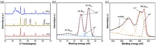Characterizations of WO3 ECE and NiO CEE. (a) XRD patterns of ITO/glass, the as-prepared WO3 film and NiO film. (b,c) High-resolution XPS spectra of W 4f in WO3 and Ni 2p in NiO, respectively.