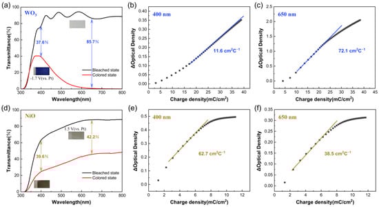 Figure 4 shows the curves of the ΔOD of WO3 and NiO at 400 nm and 650 nm, respectively, as the charge density increases. The slope value obtained from the fit of the straight line part at the front of the curve is the CE value. When Pt sheets are used as both reference and counter electrodes in the two-electrode system, observation of the values of the charge in the transverse coordinate shows that the charge required to apply −1.7 V for the WO3 film is 35–40 mC·cm−2, while the charge required to apply 1.5 V for the NiO film is 10–12 mC·cm−2, which indicates that the electrochemical reactivities of WO3 and NiO are not comparable. This further supports that the conventional WO3-NiO electrochromic devices have difficulty achieving long-term stable operation. According to Figure 4b, the CE of WO3 at 400 nm is only 11.6 cm2·C−1. When WO3 and NiO are assembled into a device, the theoretical CE of the device could be significantly improved. The higher CE means that the complementary devices can achieve a faster ion embedding rate during the electrochromic coloring process with the same applied voltage drive, thus realizing a fast color change.