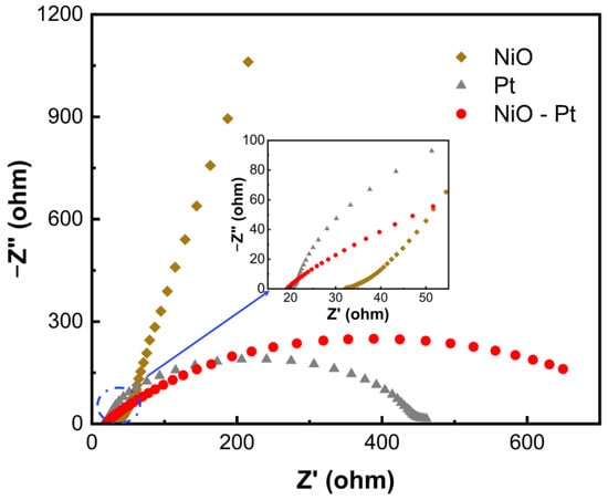 Electrochemical impedance spectroscopy (EIS) measurements were employed to investigate the intrinsic kinetics of the NiO, Pt and NiO-Pt electrodes. Figure 5 compares the Nyquist plots of symmetrical cells assembled with different counter electrodes. Impedance spectra were measured from 10−2 to 105 Hz, with 5 mV of amplitude and a zero bias of potential. The intercept of Nyquist plots on the real axis reflects series resistance (Rs), and the semicircle in the middle frequency region indicates the value of the charge-transfer resistance (Rct) at the electrode/electrolyte interface. In general, the gain or loss of electrons occurs where the electrode is in contact with the electrolyte; we focus on comparing the charge-transfer resistance (Rct). Compared to that of the NiO electrode, the Rct value of the composite NiO-Pt electrode partially covered with Pt was significantly decreased. This indicates that the reactivity of partly covered NiO-Pt CE is enhanced in the presence of Pt; the electrons could be flowed through the external circuit to the counter electrode easily.