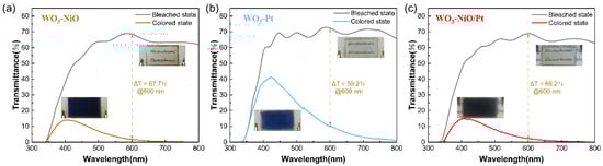 In conclusion, the ECM/REDOX/CCE structure is introduced into the complementary electrochromic system, and a bifunctional NiO-Pt CE with electrochromic and electrocatalytic activities was prepared. The corresponding new ECD shows significant electrochromic performance improvement, with a transmittance contrast of 67.3% at 600 nm and fast response times. During the durability characterization, the transmittance change of ECD remained at 54% after 10,000 cycles, which was about 91% of the original state. The improved EC performance of the device is attributed to the synergy of the reaction process of the WO3 and NiO electrodes, and the problem of electrode charge mismatch is overcome via the introduction of a partially covered counter electrode of NiO-Pt. This research provides promising strategies for the design of complementary ECDs, which can be generalized and applied to smart windows in the future.