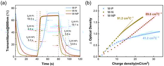 (a) Transmittance switching time characteristics between the bleached and colored states for electrochromic devices measured 1.2 and −1.5 V at 600 nm. (b) Variations of OD with respect to the charge density for W-P, W-N and W-NP.