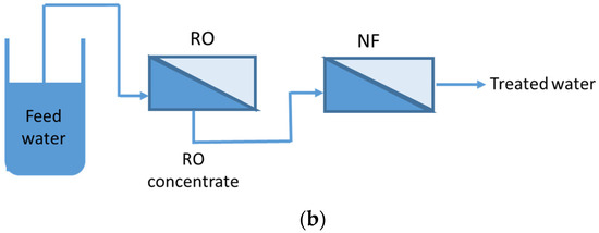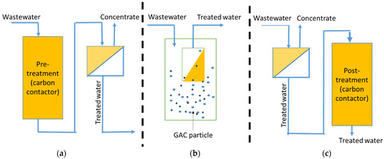 Figure 1a shows a pretreatment where the wastewater is firstly passed through to remove contaminants prior to membrane filtration. This enables the system to optimize removal efficiency by changing the physicochemical characteristics of the treatment system prior to the membrane.