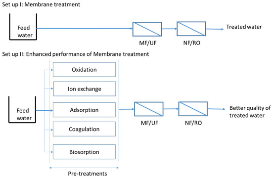 A pretreatment refers to any form of treatment administered prior to membrane filtration to eliminate contaminants that could potentially cause fouling or harm to the membrane. Various types of pretreatments, including oxidation, adsorption, ion exchange, coagulation, and biosorption, can be employed to mitigate membrane fouling and optimize energy utilization [28,29,30,31]. The implementation of such pretreatment methods improves the efficiency of membrane filtration and results in the production of higher quality treated water [32] (Figure 2).