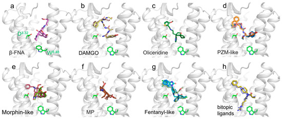 Close-up view of the µOR binding site. µOR structures are shown as gray cartoon representations, D3.32 and W6.48 are displayed as green stick representations. (a) β-FNA is in violet (4dkl); (b) DAMGO is in light yellow (6dde) and light brown (8efq); (c) oliceridine is in dark green (8efb); (d) PZM21 is in blue (7sbf) and pink (8efo) and FH210 is in orange (7scg); (e) BU72 is in raspberry (5c1m) with morphine in green (8ef6); (f) MP is in brown (7t2g: 2 poses). (g) fentanyl in blue (8ef5), SR17018 in cyan (8efl) and LFT in light green (7t2h); (h) C5 guano is in blue (7u2l), and C6 guano is in gold (7u2k).