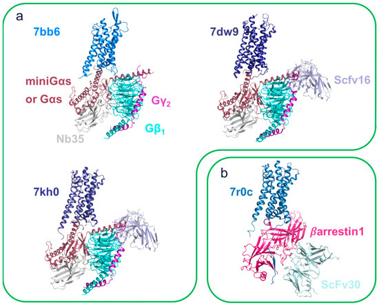 - Carpenter, B.; Tate, C.G. Active State Structures of G Protein-Coupled Receptors Highlight the Similarities and Differences in the G Protein and Arrestin Coupling Interfaces. Curr. Opin. Struct. Biol. 2017, 45, 124–132. [Google Scholar] [CrossRef]