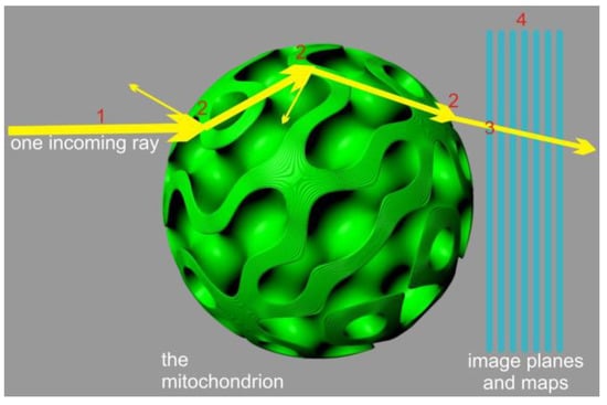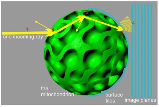 The computational effort required for the model depicted in Figure 5 does not significantly increase when compared to model depicted in Figure 4 for two reasons: (a) the scattering events account for the majority of the computing time, and (b) the number of surface tiles can be kept low, considering the small dimensions of the mitochondrion. If 1/4λ patches are used some 100 nm in diameter on the x axis, using angular tiling of the surface, tiles are required, leading to the same amount of integration steps per pixel per image plane.