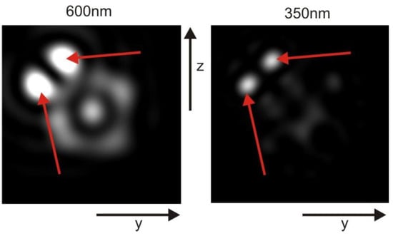 Quasi-dispersion phenomenon, showcasing the region where the best geometric focus occurs. In the case of 600 nm light, the area of optimal focus is located approximately 3.3 µm behind the mitochondrion (displayed on the left side of the figure). Conversely, for 350 nm light, the region of optimal focus is found approximately 2.6 µm behind the mitochondrion (depicted on the right side of the figure). The diameter of the panels in the figure is 2 µm.