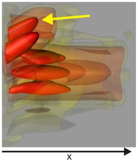 Iso-intensity 3D plot of the intensity pattern after passing through the mitochondrion. The yellow arrow highlights the peaks that arise from the waveguide property.