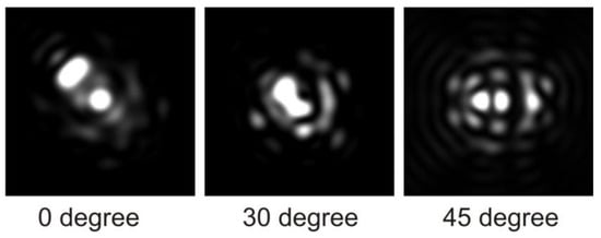 The figure demonstrates the significant changes in the pattern at the focus for different values of the rotation angle. Additionally, the intensity within the central beam exhibits fluctuations of approximately 41%, while the total transmitted energy only varies by around 9%, depending on the angle of incidence (for RI = 1.48).