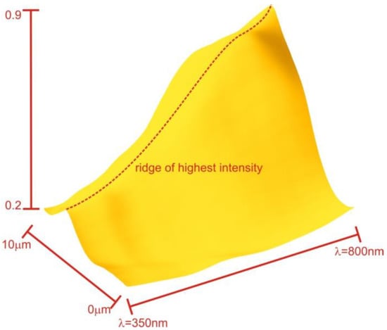 The peak ridge depicted in Figure 12 is distinct from the previously discussed geometric focus and consistently appears behind that region. Furthermore, the position of this peak is influenced by the rotation of the mitochondrion and slight variations in the refractive index (RI), whereas the overall power is less affected. Both the peak position and power are sensitive to RI alterations in the membrane transitions.