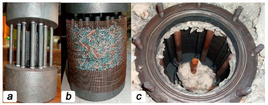 The rest of the reactor ensured a clamping of the oxygen-conducting membranes, keeping the catalyst in contact with the membranes and supplying steam into the membranes. In order to provide excellent gas tightness for the reaction zone, the membranes were sealed by high-temperature glass Schott No. 8252 (Germany) with a melting point of 950 °C. For sealing, rings 2 mm thick were cut from a glass tube of the appropriate size were glued to the ends of the membrane, which was then set in the reactor (Figure 1a). Then the catalyst was carefully poured on the outer side of the oxygen-conducting membranes so that the entire surface of the tubes was covered with granules. In this case, the thickness of the catalyst did not exceed 1 cm near the methane feeding point. A total of about 300 g of the catalyst was loaded into the reaction zone (Figure 1b).
