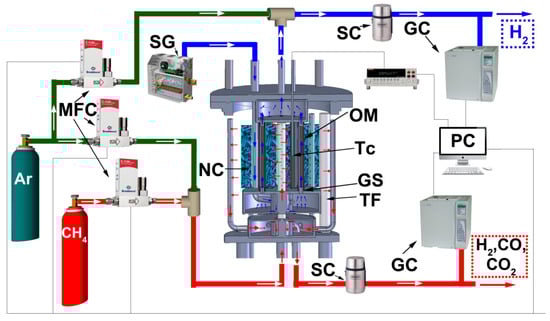 Schematic representation for the experimental reactor and auxiliary units for feeding control and measurements. MFC—mass flow controllers, SG—steam generator, SC—steam condenser, NC—nickel-containing catalyst, OM—oxide membrane, Tc—thermocouple, GS—glass sealant, TF—tubular furnace, GC—gas chromatograph, PC—personal computer.