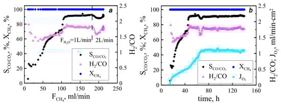 Figure 4 presents a comparison of the obtained results with ones reported earlier for single-tube reactors [25]. It can be seen that the relative fluxes of oxygen and hydrogen are in good agreement for both reactors. However, at high values of the methane flux, a slight increase in the efficiency of the oxygen-conducting membranes is observed. It should be stressed that in this work, the steam supply per square centimeter of the membrane surface was set at 7 mL/min, and in the case of a single-tube reactor, it reached 26 mL/min∙cm−2. Increasing the steam flow to 14 mL/min∙cm−2 was found to lead to an increase in oxygen permeability, which also indicates a more efficient distribution of oxygen partial pressure when a ten-tube reactor is applied. It is also important to emphasize that the ratio of hydrogen to carbon monoxide does not exceed 2, which indicates the absence of soot formation in the reaction zone.