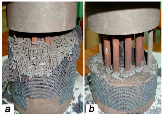 Figure 5 represents the appearance of the reaction zone still filled by catalyst (a) and partially cleaned (b) after the experiments. It should be noted that the catalyst granules, as well as ceramic membranes, retain the original shape and demonstrate excellent structural integrity. Moreover, it is important to highlight that the catalyst used does not evince any degradation signs associated with the soot formation.